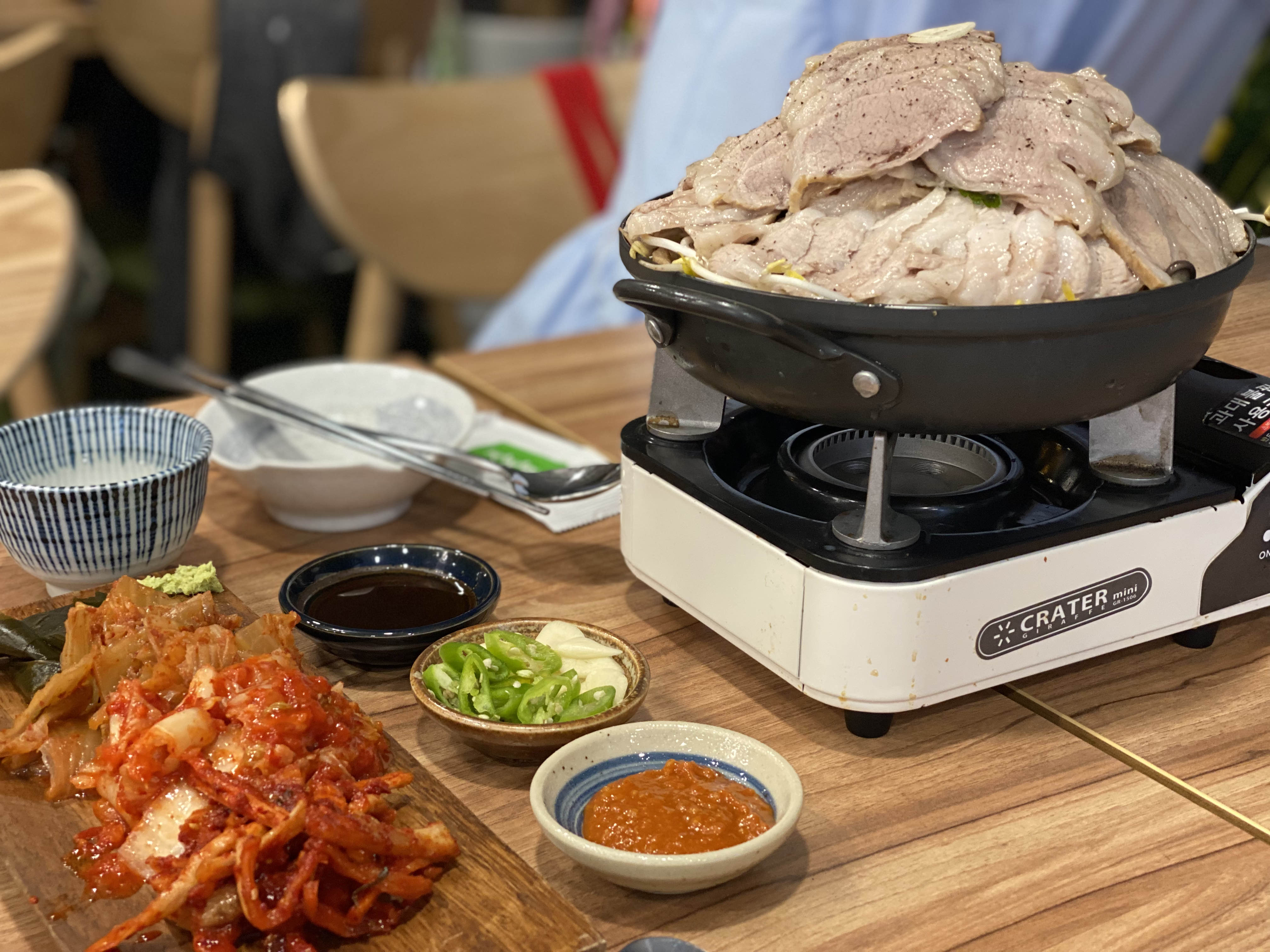 잠시 수다를 떨고 반찬을 맛보다가 메인 깍두기 살이 나왔어요. 일단 철판에 올리기로 했거든요.군침이 절로 나오거든요. 뭔가 양이 적은가 했더니 아니었어요.(처음에 배고파서 ㅋㅋ 그래서 매일 남겨도 나오게 되는 것 같아요….)