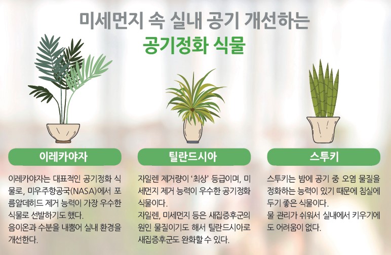 안스리움은 열대 지역이 원산지이기 때문에 온도가 높고 습기가 많은 곳을 선호하며, 일산화탄소나 톨루엔, 암모니아 제거 능력이 매우 높아 공기 정화 능력이 뛰어난 식물이라고 합니다.그러나 습기가 많은 곳을 좋아한다고 해서 물을 너무 많이 주면 뿌리가 썩기 때문에 일주일에 한 번 정도 주는 것이 적당합니다. 아울러 위 공기정화식물은 모두 잎을 통해 정화능력을 발휘하므로 잎을 잘 닦아주는 것이 필요합니다.